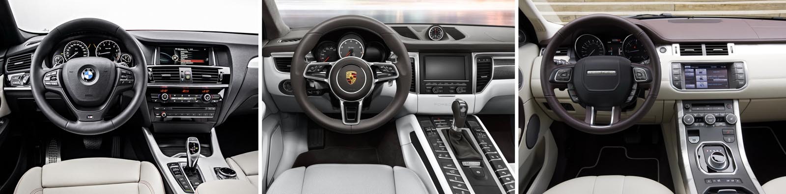 Cine caută o atmosferă cât mai sportivă probabil va fi cel mai încântat de Macan, dar adevărul este că toate trei SUV-urile mizează mai mult pe lux şi spirit high-tech. Doar Evoque este, în aparenţă, uşor mai spartan, însă la capitolul personalizare interioară a contribuit şi soţia unuia dintre cei mai cunoscuţi fotbalişti din lume: Bekham. O carte de vizită de calibru.