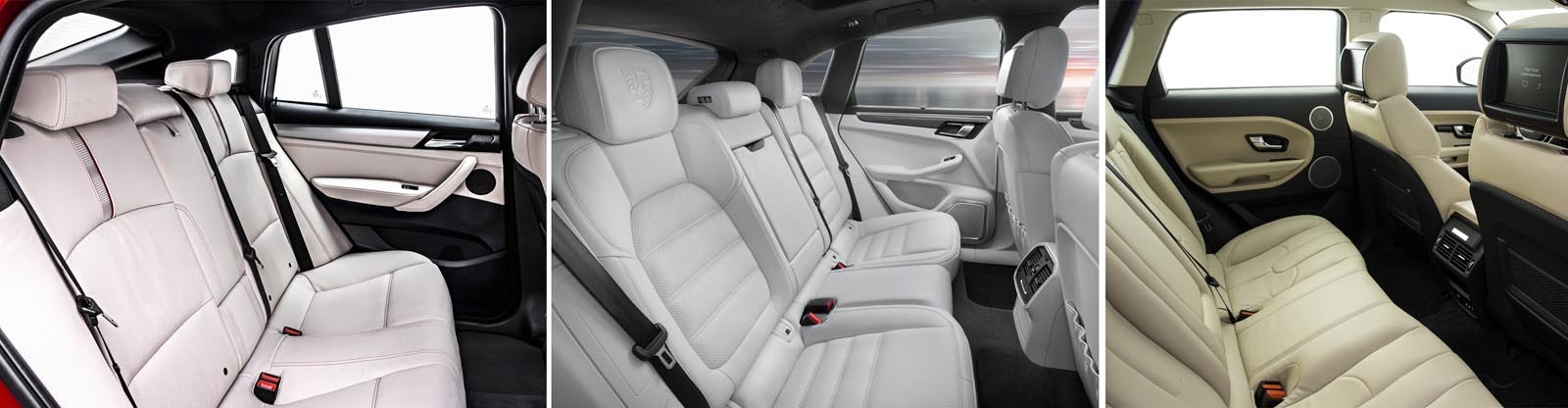 Ca echipamente de lux şi siguranţă, cele trei SUV-uri sunt cam la acelaşi nivel, dar X4 promite un avans la capitolul conectivitate şi aplicaţii. În spate, bancheta oferă loc pentru trei persoane, dar, în practică, e potriviă mai degrabă pentru două (lucru mai clar în cazul lui Evoque Coupe).