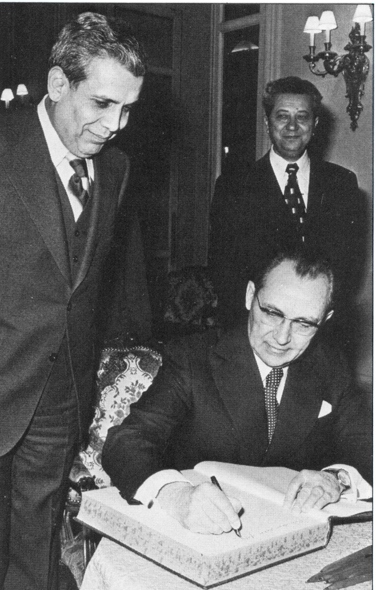 Manea Mănescu semnează în cartea de aur a uzinei, sub privirile fericite ale lui Georges Taylor, născut în România şi PDG Citroën
