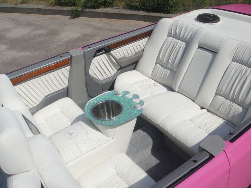 Pe lângă culoarea roz a caroseriei, cabrioletul a primit şi un look de E-Class W 210 (generaţia produsă între 1995 şi 2003), pentru a avea un aspect mai modern, dar şi jante cromate în stil bling. Rezultatul, în galeria foto, dar şi în video-ul de mai jos: