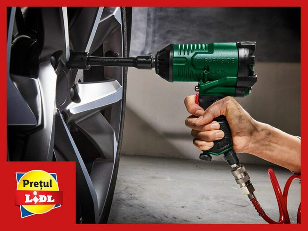 Cea mai bună ofertă din noul catalog Parkside valabil pentru luna aprilie la Lidl: un pistol pneumatic de înșurubat cu percuție la prețul de 169 de lei. Acest dispozitiv oferă o percuție reglabilă în 4 trepte la o turație nominală de 7000 rpm. Pistolul pneumatic de înșurubat pentru jante este oferit în pachet cu următoarele accesorii: 10 capete de cheie tubulară, 1 prelungitor, 1 niplu rapid de ¼” (6,35 mm), 1 flacon de ulei, o cheie pentru șuruburi cu cap hexagonal înecat și un set de capete de cheie tubulară cu mărimile: 9, 10, 11, 13, 14, 17, 19, 22, 24, 27.