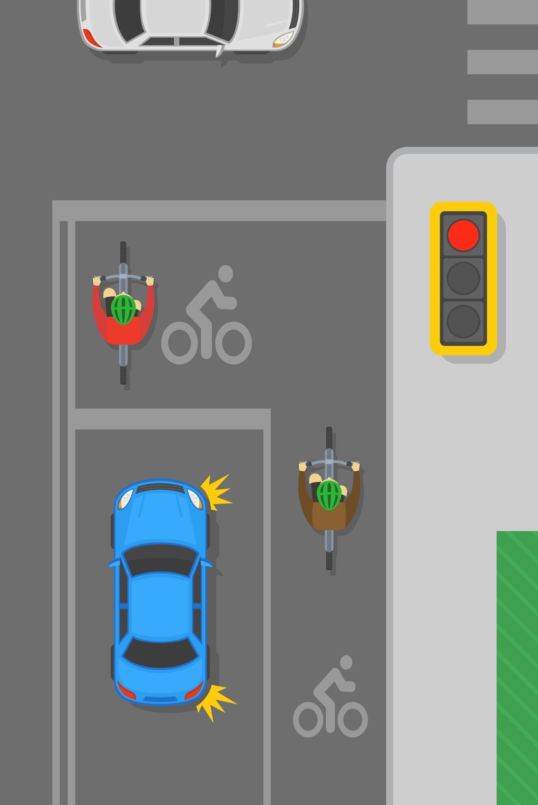 În plus, aceștia se vor putea poziționa pentru un viraj la stânga în marcajul dedicat lor. Acesta va funcționa după același principiu ca linia de stop din intersecții. Astfel, ei vor putea să treacă de la o pistă de biciclete situată pe partea dreaptă către una din partea stângă chiar și atunci când este aprinsă culoarea roșie a semaforului.