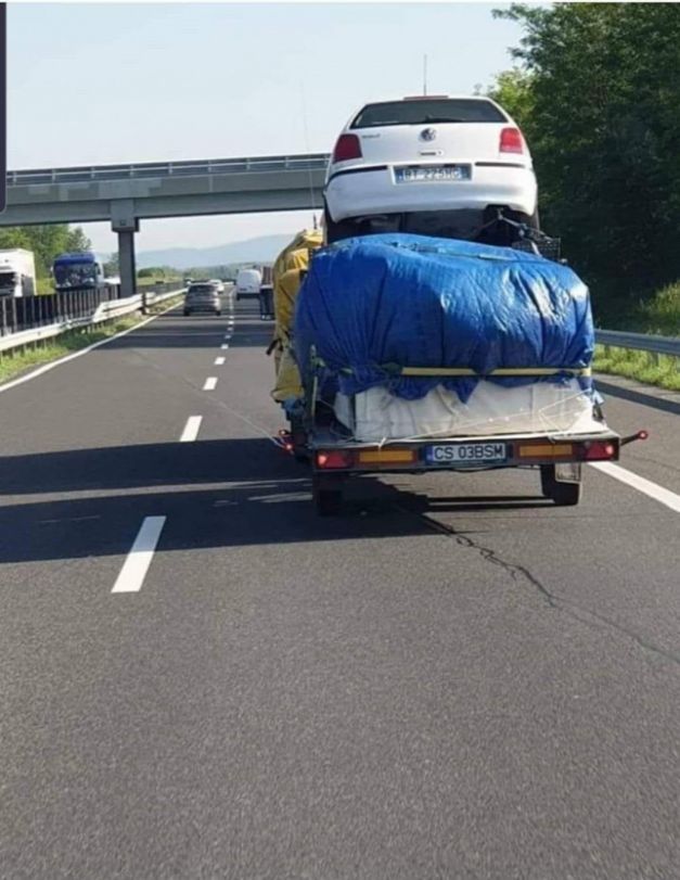 Un şofer român a fost fotografiat în timp ce circula pe Autostrada M7 din Ungaria, transportând o maşină cocoţată pe o remorcă plină cu bagaje. Mai exact, pe bagaje a fost urcat un Volkswagen Polo.