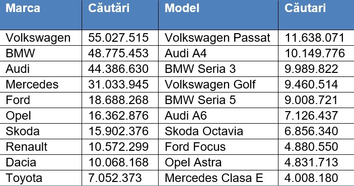 Cele mai căutate branduri de maşini pe Autovit.ro în 2018 au rămas Volkswagen (peste 55 milioane de afişări), BMW şi Audi. Ca şi modele, Volkswagen Passat a fost pe primul loc – 11.638.071 de căutări, urmat de Audi A4 cu 10.149.776 şi BMW Seria 3 cu 9.989.822 căutări.