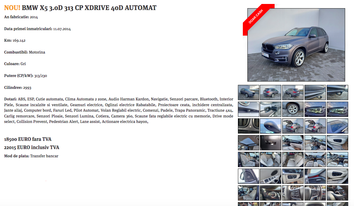 Banca Transilvania vinde un BMW X5 fabricat în 2014, cu aproape 170.000 de kilometri la bord, cu puțin peste 22.000 de euro. Mașina este echipată cu o motorizare diesel și se poate mândri cu o putere de 313 cai putere, în timp ce transmisia se face prin intermediul unei cutii automate.