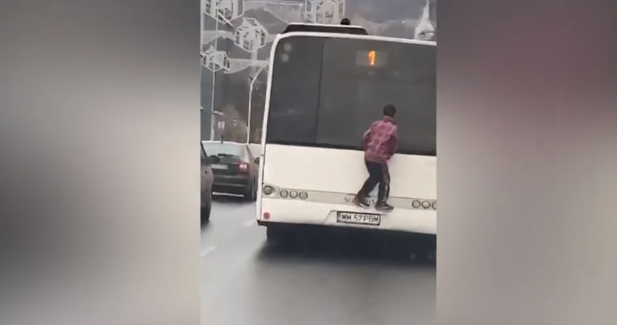 Un copil din Baia Mare a fost filmat în timp ce călătorea agăţat de spatele autobuzului societății de transport public.