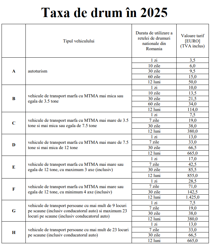 Rovinieta pentru autoturisme (Categoria A) costă în 2025: