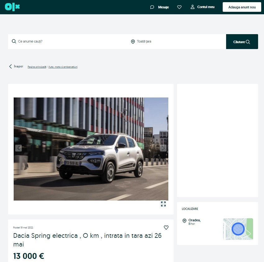 Este una dintre cele mai ieftine mașini electrice. Cu toate acestea clienții au de așteptat câteva luni bune din momentul în care comandă mașina, până când intră în posesia ei. Pentru cei care nu mai au răbdare însă există unele soluții. Pe un site de comerț online am găsit una dintre ele. Proprietarul unei Dacia Spring și-a scos mașina la vânzare pe OLX.