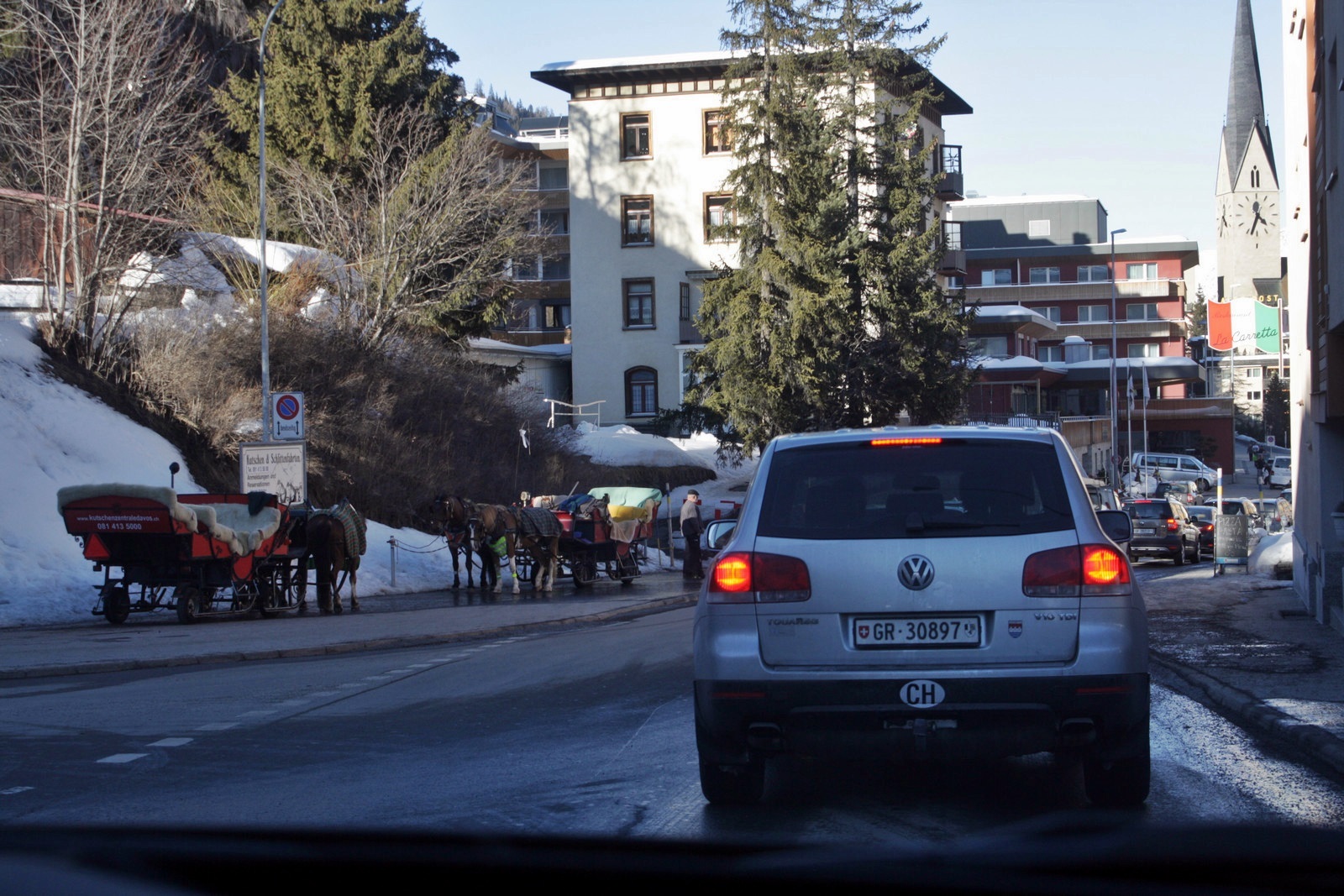După câteva ore bune de condus şi jumătate de oră de control vamal – da, ai ghicit, am fost singurii opriţi şi controlaţi – am ajuns la Davos, unde am dat de căruţe. Însă aici au rol de agrement şi nu de cărat fier. Iar lumea dă bani ca să se plimbe cu ele. Asta după ce coboară, cel mai probabil, din RS-urile lor – n-am mai văzut niciodată în viaţa mea atâtea RS-uri de la Audi câte am văzut în excursia asta. Iar hotelul pe care-l vezi în poza de mai jos este cea mai urâtă clădire din Davos.