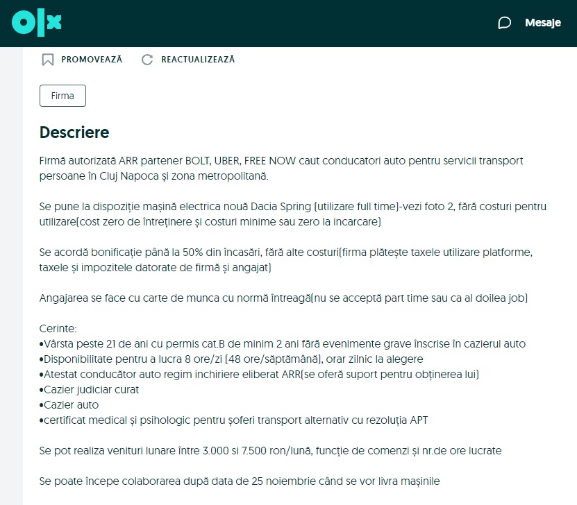 Dovadă este un anunț găsit pe OLX prin intermediul căruia o firmă anunță că este în căutarea unor conducători auto pentru servicii de transport persoane în Cluj Napoca și zona metropolitană.