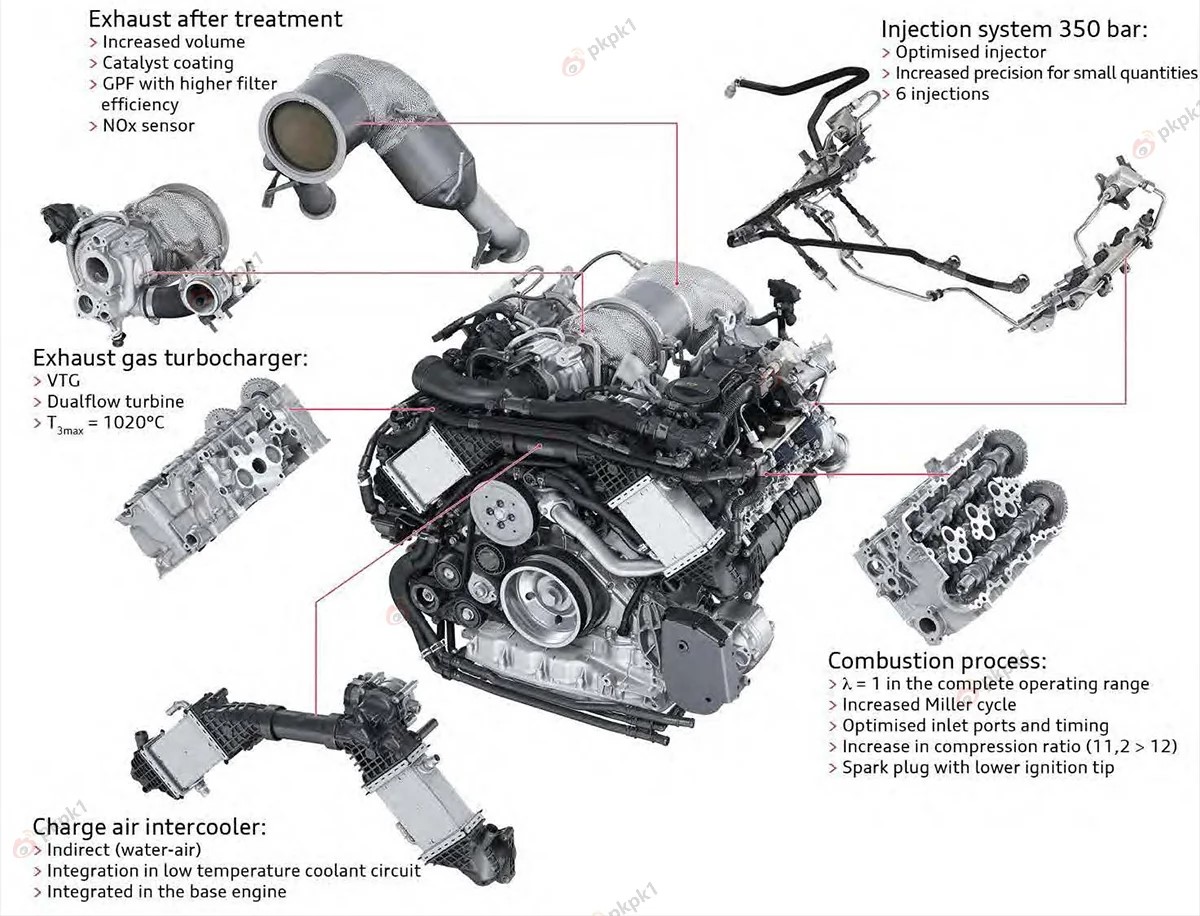 De asemenea este folosita supraalimentarea cu turbocompresor cu geometrie variabilă, astfel aportul de aer este tot timpul optim iar prin adoptarea unor aliaje cu frecări reduse și un sistem de distribuție variabilă cu control electronic se reduce mult din efortul depus de motor pentru a mișca toate componentele interne din ansamblul rotativ precum arbori, biele, supape, pistoane, segmenți, iar aprinderea se întâmplă târziu, ceea ce reduce presiunile și temperaturile din camera de ardere si implicit nivelul de particule, CO² și NOx.