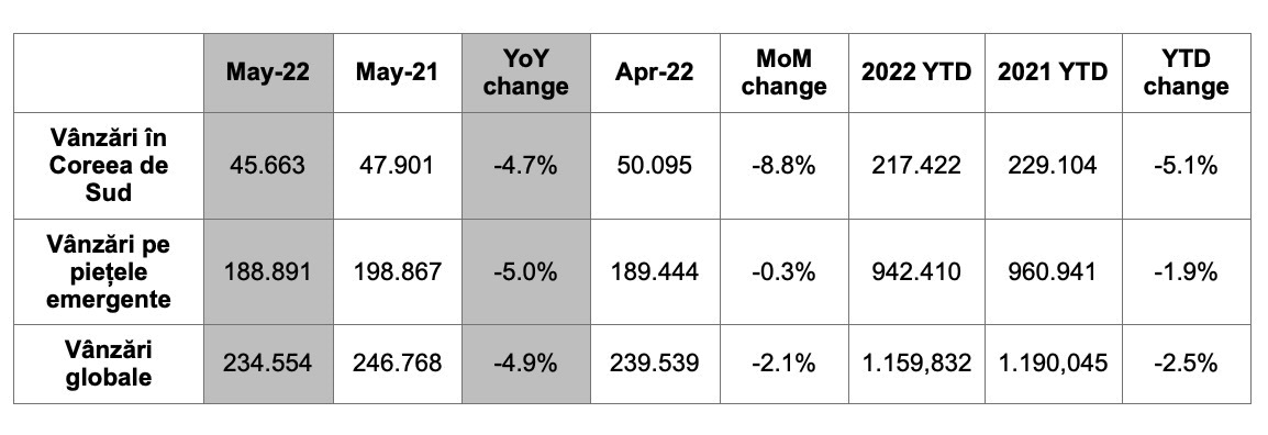 Producătorul de automobile sud-coreean Kia raportează vânzări de 234.554 de automobile în luna mai a acestui an. Totalul reprezintă o scădere cu 4,9 % comparativ cu aceeași perioadă din 2021.