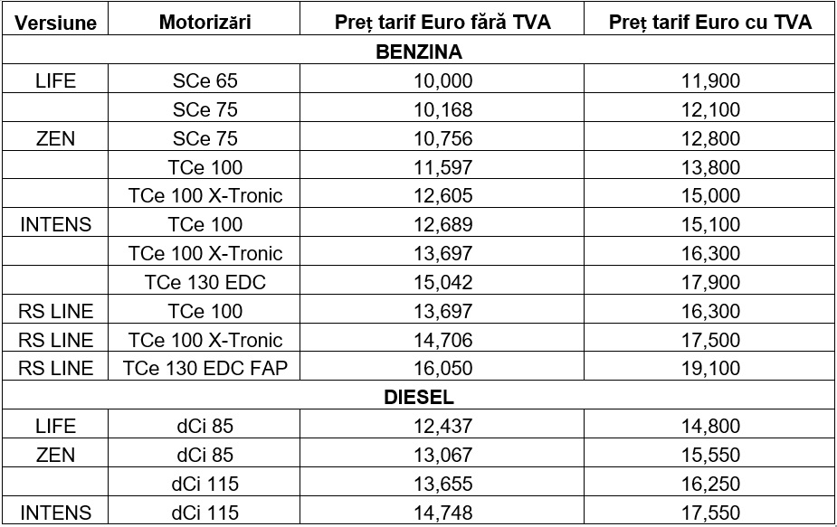 Oferta producătorului francez include un preț de pornire de 11.900 de euro (TVA inclus) şi propune o gamă completă de motorizări pe benzină – toate noi în gamă – și diesel, a căror putere acoperă o paletă largă: de la 65 CP la 130 CP.