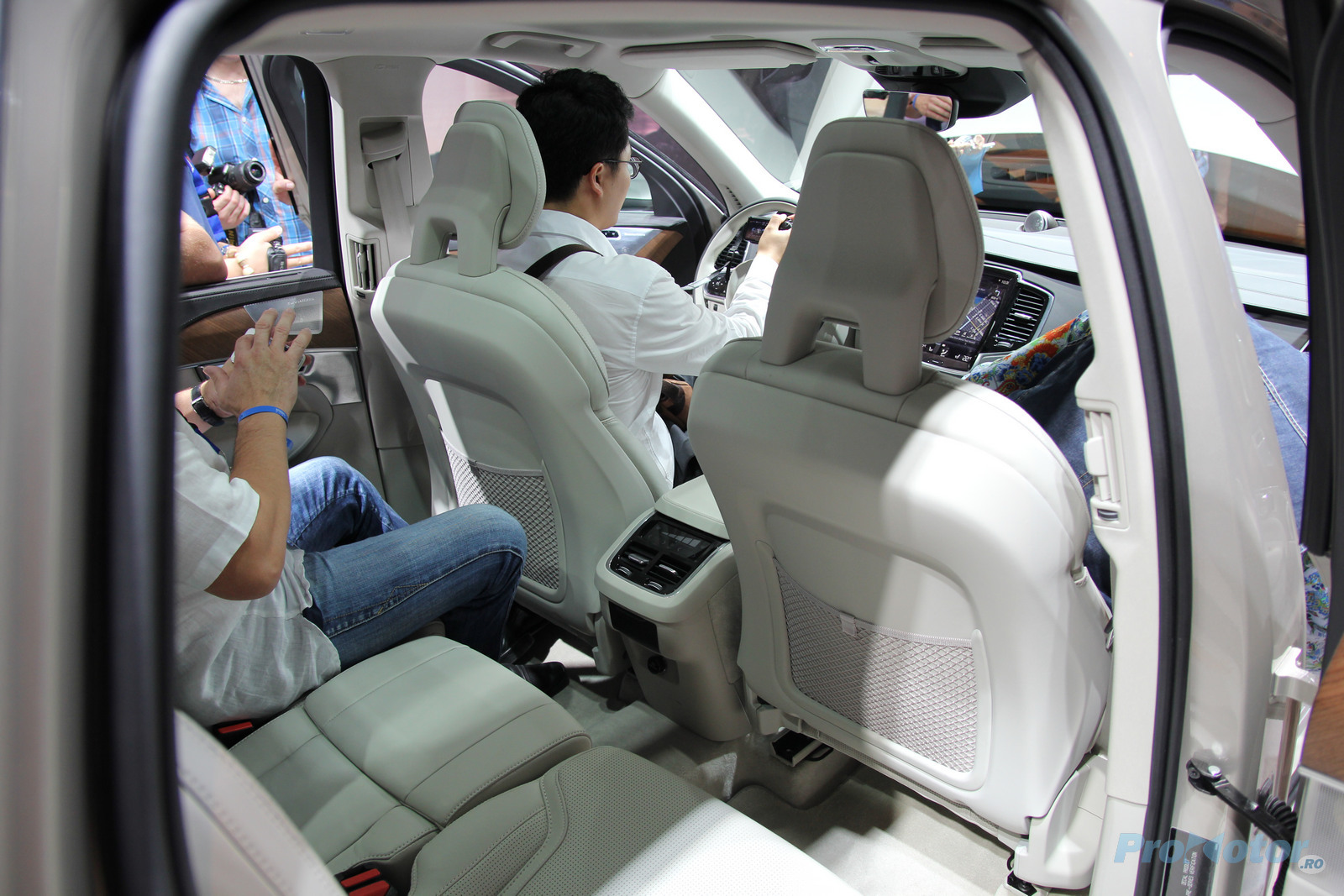 Materialele sunt într-adevăr premium (cel puţin pe maşinile expuse la salon), cu piele moale şi fină şi cu inserţii de lemn de cea mai bună calitate. Scaunele din faţă îşi păstrează profilul binecunoscut de la modelele Volvo din ultimii 20 de ani (e de bine, fiindcă sunt extrem de confortabile), iar bancheta din spate oferă spaţiu berechet pentru trei adulţi. Totodată, bancheta poate fi culisată înainte/înapoi pe porţiuni, aşa că poţi mări sau micşora portbagajul după nevoi. Nu am reuşit să mă aşez pe scaunele de pe ultimul rând (din portbagaj), dar la o inspecţie ochiometrică mi s-a părut că este loc chiar şi pentru doi adulţi.