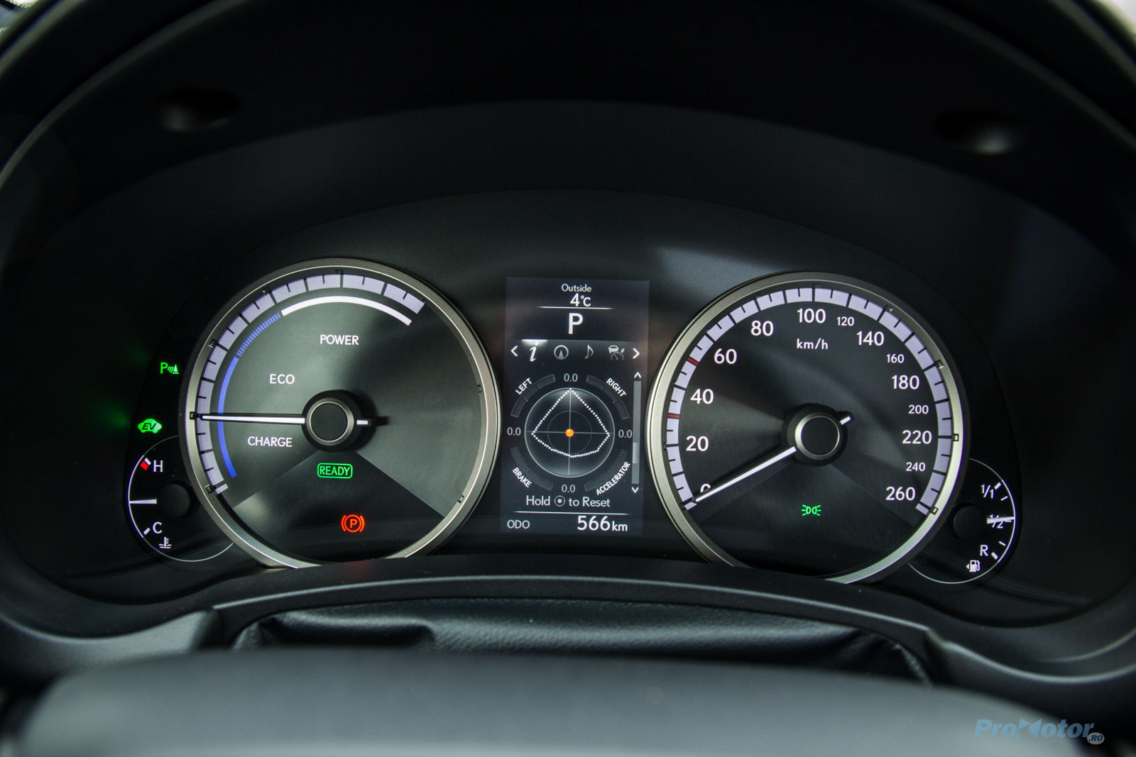 În fine, dacă îţi poţi stăpâni puseurile de entuziasm o să apreciezi ţinuta bună de drum, menajată de ruliu chiar şi pe porţiuni virajate abordate ceva mai sportiv. Există trei moduri de rulare – eco, sport şi sport+ – iar în oraş suspensia face o treabă bună şi silenţioasă în anularea obstacolelor specifice mediulul urban atunci când se selectează modul eco. Per total, manevrarea prin oraş se face uşor pentru că direcţia te ascultă destul de atent. În materie de consum, Lexus specifică o valoare mixtă teoretică de 5,3 l/100 km. În cadrul testului, am obţinut valori care variau între 6,2 şi 8,5 l/100 km, în condiţiile în care am abordat un stil de condus normal, pe porţiuni de drum judeţean, naţional şi autostradă.