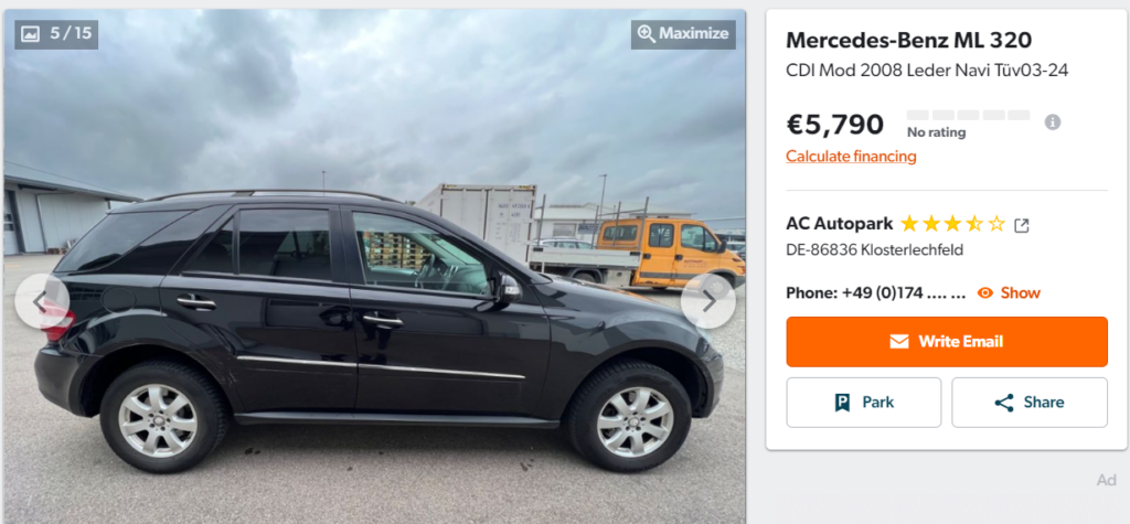 A doua generație a lui Mercedes ML a fost lansată în 2005 și a adus modificări importante. Mercedes avea experiență cu vehiculele de teren prin intermediul Clase G. ML a fost creat ca o alternativă nu la fel de extremă, așa cum sunt G-urile. Exemplarul găsit de noi este din anul 2007 și are un motor V6 diesel de 3,0 litri. Puterea dezvoltată este de 224 de cai. Mașina are la bord 299.500 de kilometri.