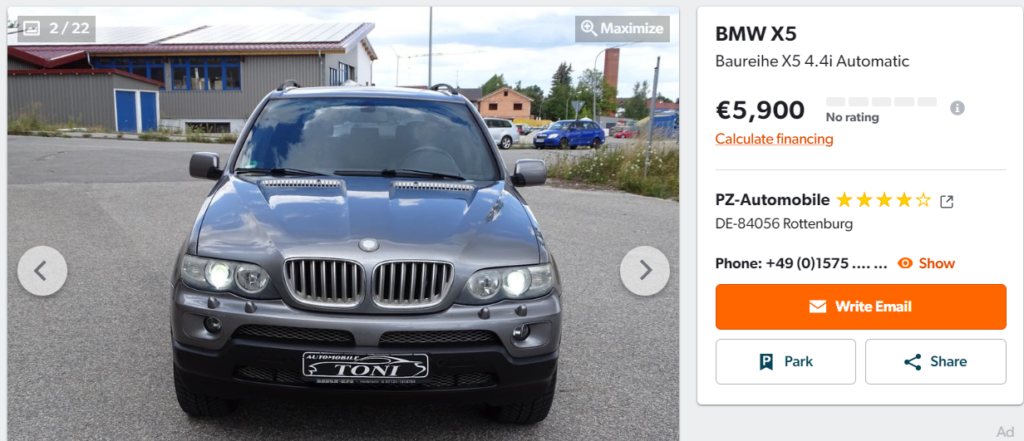Rivalul de la Munchen al lui ML. BMW X5 a fost, probabil, unul dintre primele SUV-uri cu pretenții de sportivitate. A fost, de asemenea, primul astfel de vehicul construit vreodată de producătorul bavarez. Motoarele au fost mari, cel mai mic fiind diesel-ul de 3,o litri. Noi am găsit un exemplar care are sub capotă un V8 de 4,4 litri. Motorul dezvoltă 320 de cai putere. Este un exemplar facelift, fabricat în 2004. Mașina a parcurs 225.500 de kilometri.