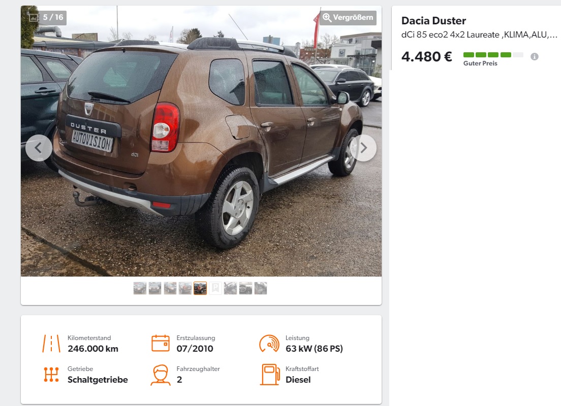 Această Dacia Duster second-hand este o alegere excelentă pentru cei care caută un SUV accesibil. Mașina are un rulaj acceptabil (… având în vedere prețul) de 246.000 de kilometri și a fost înmatriculată prima dată în iulie 2010. Motorul pe motorină are o capacitate de 1.461 cm³ și o putere de 63 kW (86 CP). Cutia de viteze este manuală. Istoricul arată că a avut doar doi proprietari, dar nu știm cât de bine a fost bine întreținută mașina de-a lungul timpului.