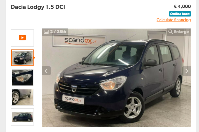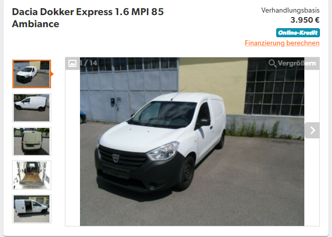 Din categoria van-urile avem Dacia Dokker, un model care te va ajuta să transporți marfă. Un Dokker găsit pe mobile.de are un motor de 1,6 litri pe benzină și care poate dezvolta până la 83 de cai putere. Mașina are un kilometraj de 130.000 de kilometri.