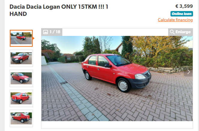 Modelul clasic sedan al Dacia Logan este în continuare căutat de români. Pe mobile.de găsim un Logan fabricat în 2009, care are un rulaj de doar 15.000 de kilometri.
