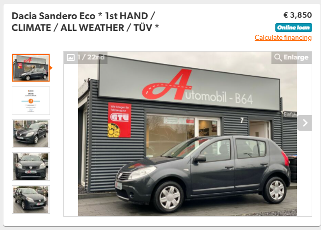 O mașină micuță ca dimensiuni, dar potrivită pentru familie. Vorbim, cum altfel, despre un model Dacia Sandero. Pe mobile.de găsim un model fabricat în 2009 cu motor de 1,1 litri pe benzină care poate dezvolta 75 de cai putere.