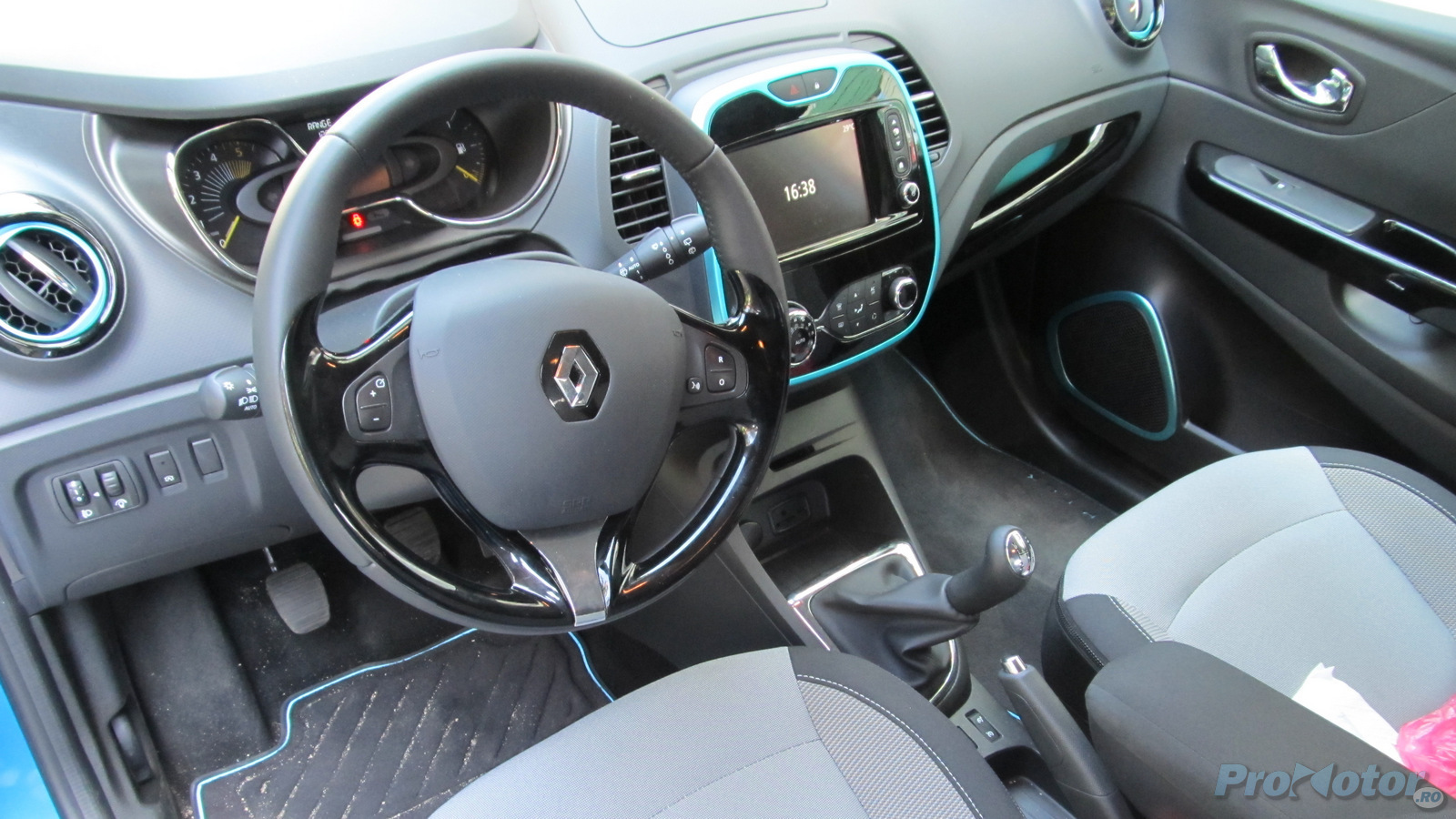 Consola centrală se diferenţiază ca formă de a lui Clio, dar conţine aceleaşi sisteme de climatizare automată şi multimedia cu ecran tactil şi, opţional, tabletă R-Link. În plus, se remarcă poziţionarea diferită a gurilor de aerisire, care la Captur, fiind mai sus, asigură o răcire mai eficientă când e foarte cald afară.