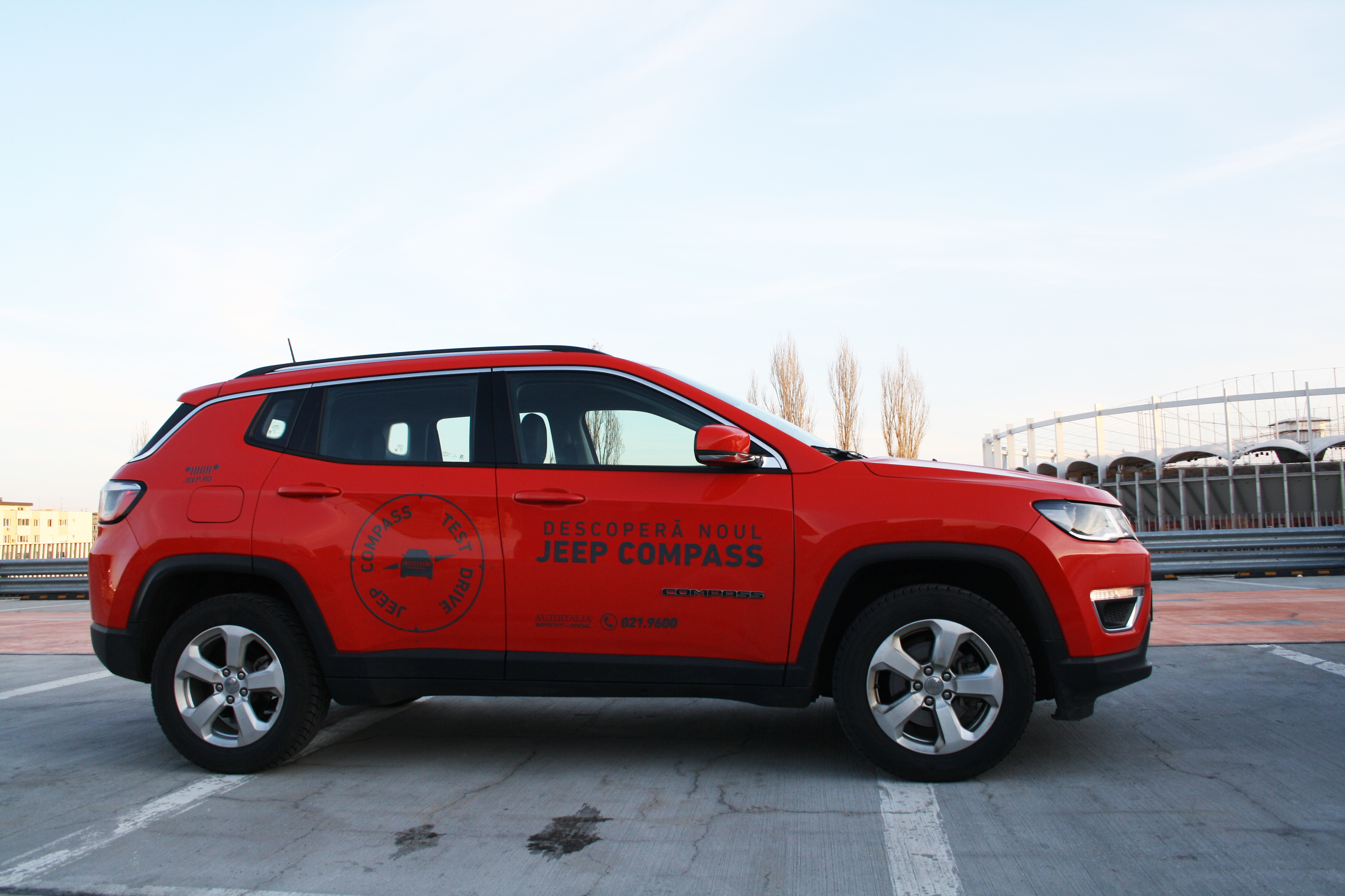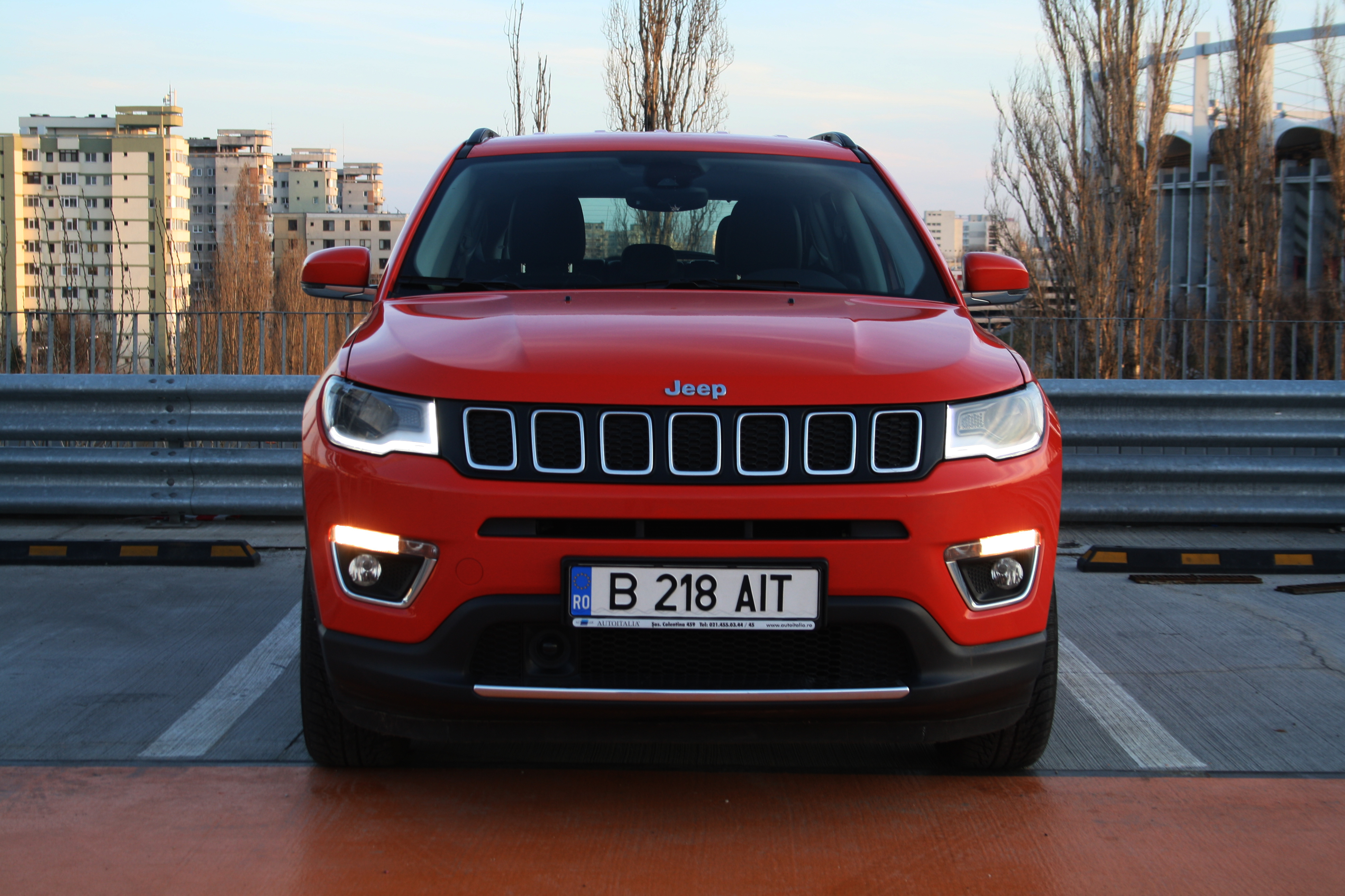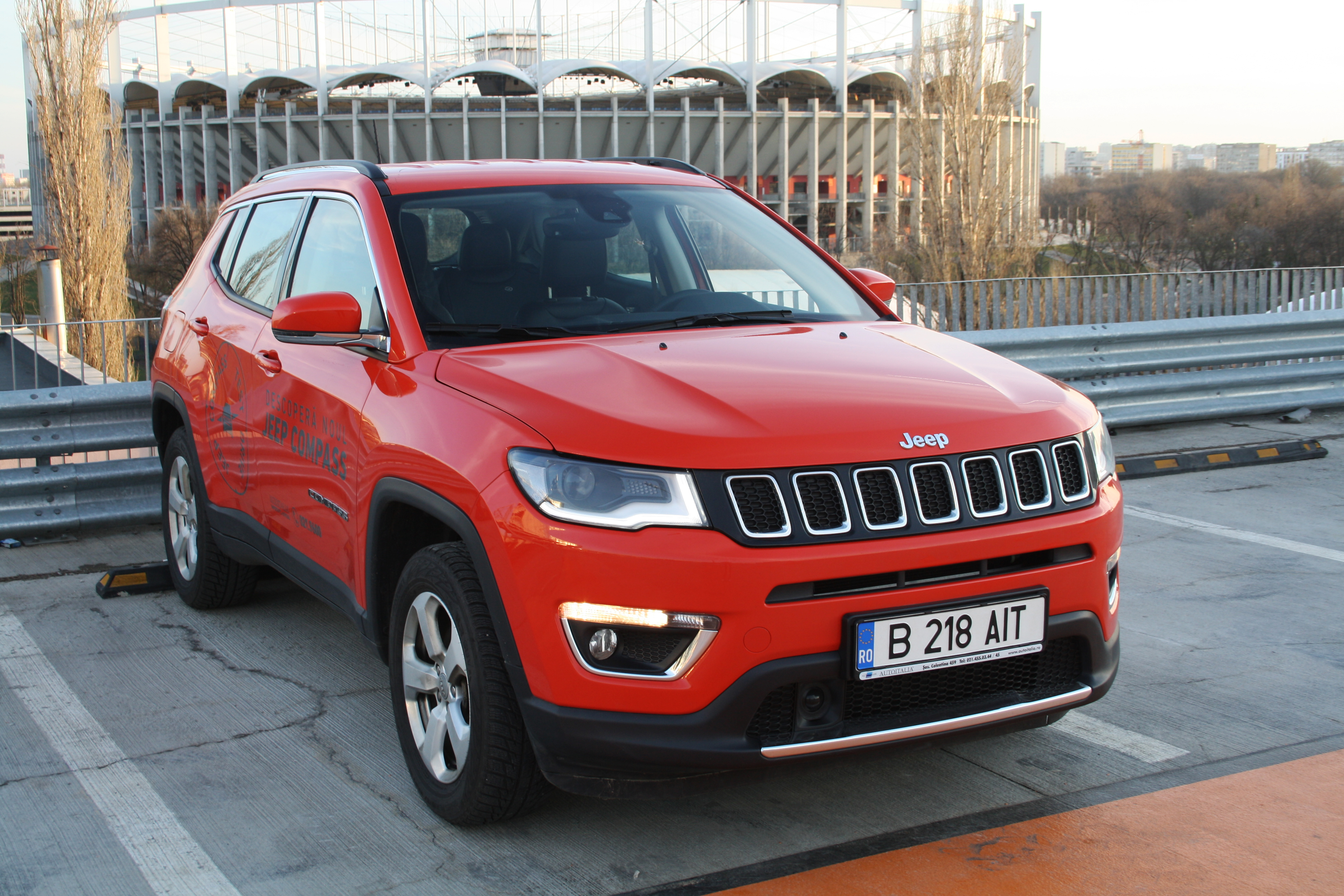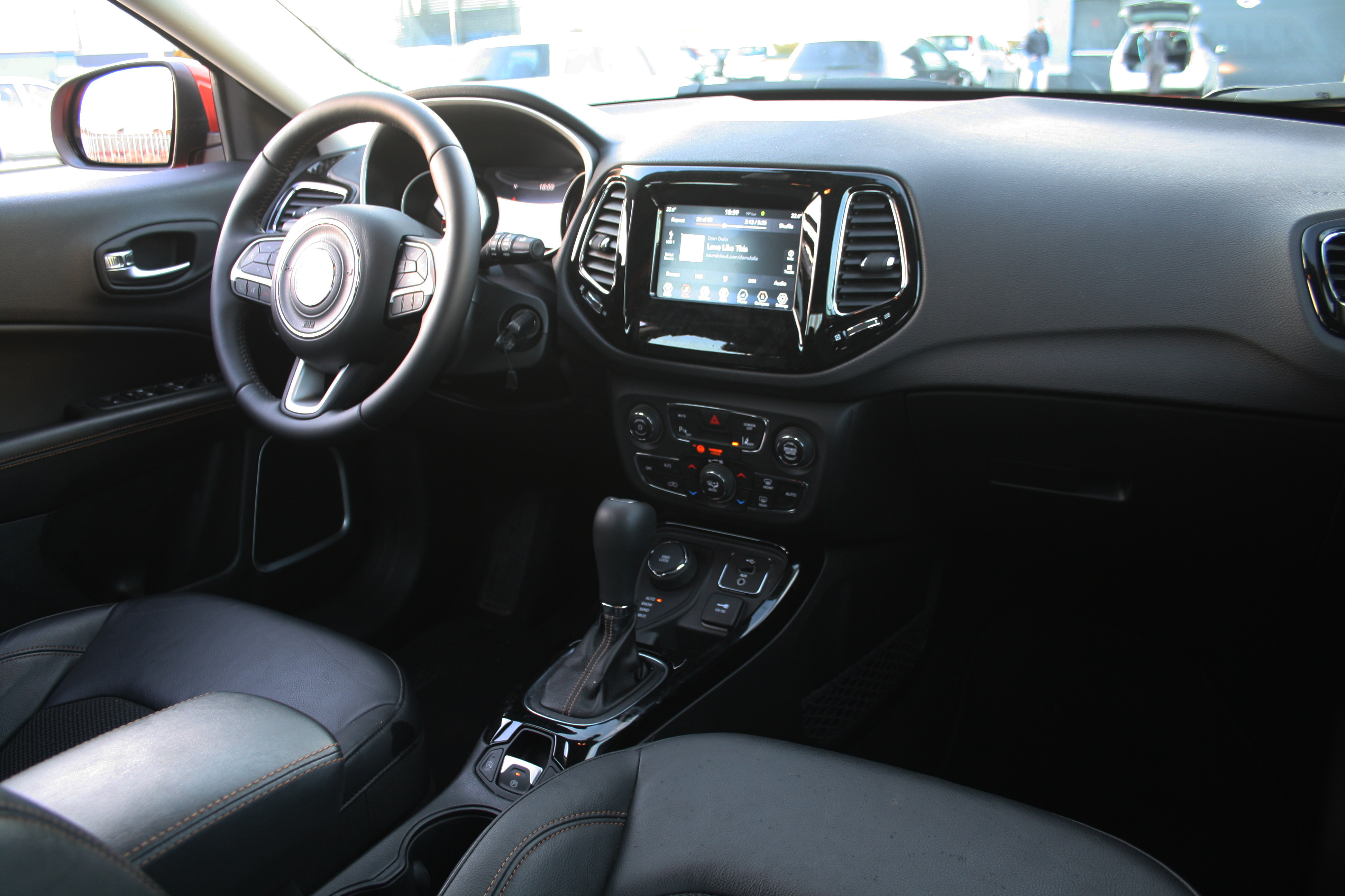 Maşina din testul nostru, un Compass cu motor de 2.0 diesel de 170 de CP, transmisie automată, 4×4, în echiparea de top Limited, arată foarte pretenţios cu jantele de aliaj şi vopseaua Spitfire Orange (opţiune la 714 de euro). Aşa încât am observat pe parcursul testului multe priviri admirativ-curioase din partea unor posesori de maşini cu sigle care necesită mult mai mulţi bani. La interior te încântă cu o tapiţerie din piele şi material textil (opţiune la 400 de euro), cu un design simetric foarte plăcut al bordului şi cu materiale de foarte bună calitate. Mă rog, din perspectiva unui client obişnuit cu rivalii premium, aş putea critica ornamentele lucioase din plastic sau calitatea mai puţin flatantă a plasticelor din părţile inferioare.