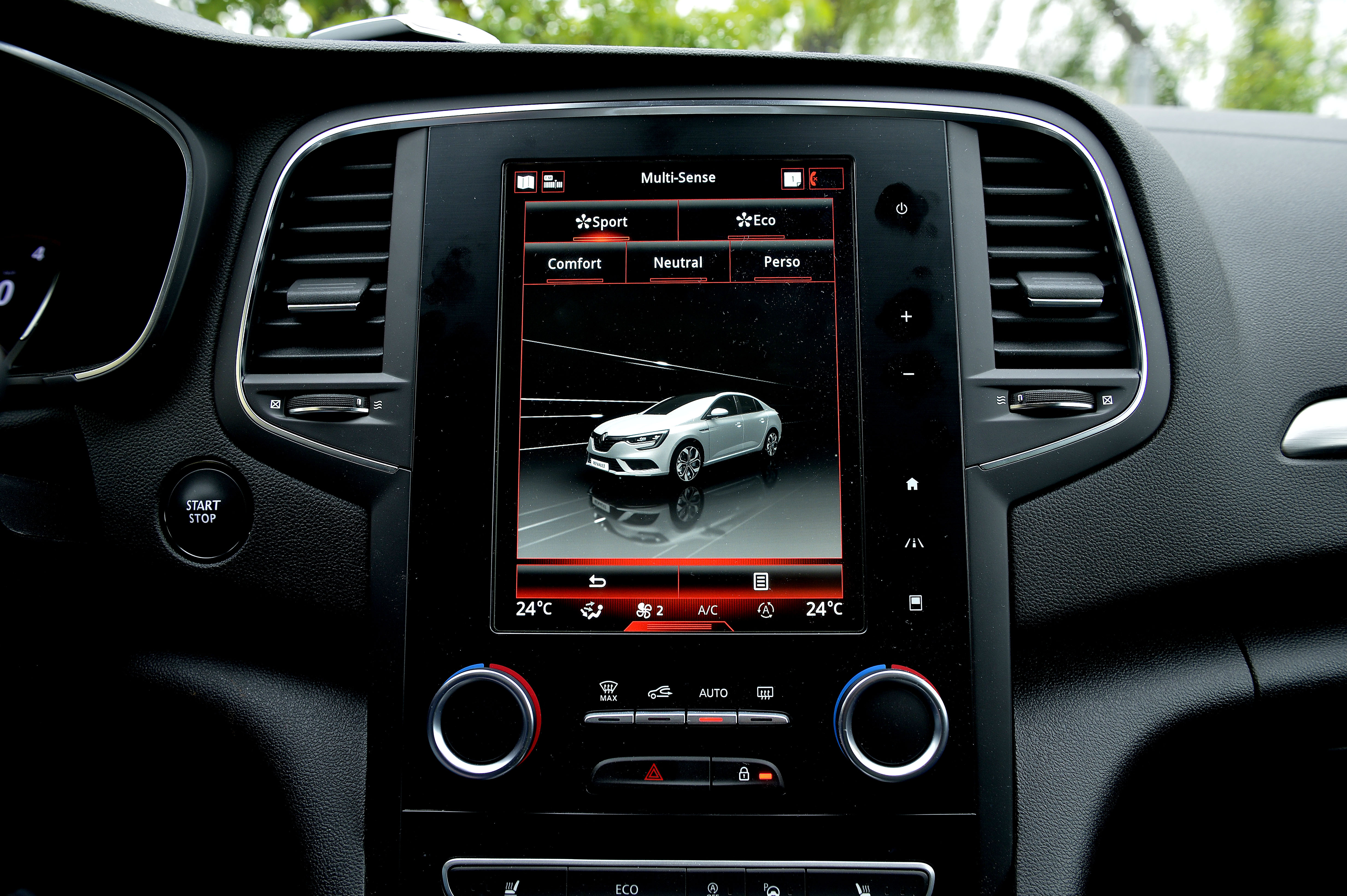 Sistemul Renault MultiSense oferă 5 moduri de condus, iar modul în care se activează este bine gândit. În orice mod de condus te-ai afla, prima apăsare afişează modurile de condus disponibile, în timp ce următoarea te duce direct în modul Sport. O a treia apăsare te duce în modul Eco. Mi-a plăcut această idee de activare, pentru că dacă eşti în modul Comfort şi vrei să faci o depăşire rapidă sau vrei mai multă putere pentru orice altă situaţie, apeşi de două ori butonul şi este deja în modul Sport. Desigur, ele pot fi selectate şi pe ecranul tactil, însă este mai uşor prin butonul fizic.