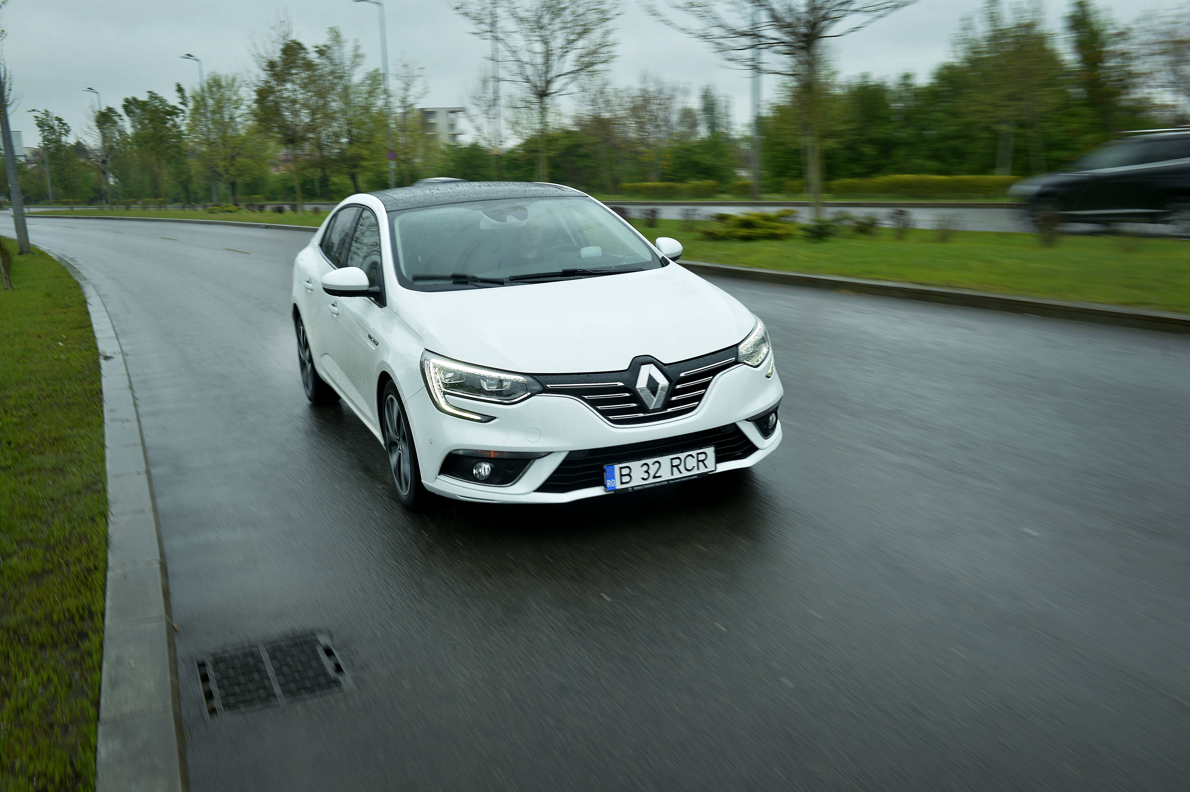 Designul lui Megane sedan este cuminte, însă luminile de zi în forma literei C, întâlnite la majoritatea modelelor Renault, îi dau un aspect aparte. Foarte bine arăta şi plafonul modelului testat, pentru că şi zona dintre trapa electrică şi lunetă era neagră, atfel rezultând un contrast puternic cu vopseaua albă.