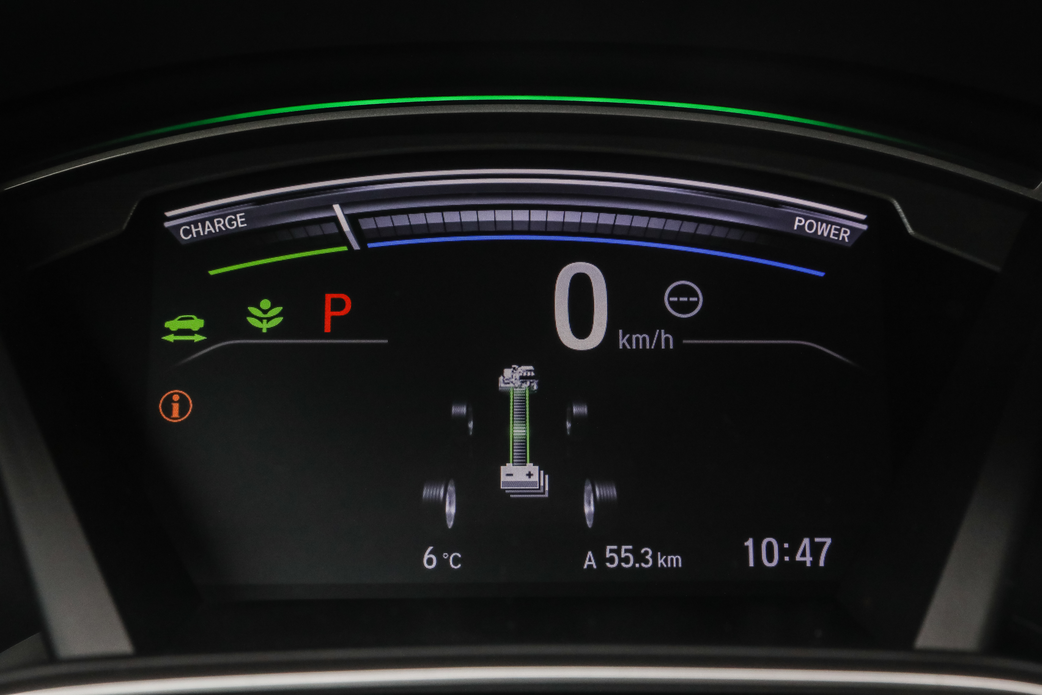 Zona cadranelor este complet digitală şi nu avem turometru. În coltul din stânga avem în schimb un indicator al nivelului de încărcare al bateriei. Zona centrală este configurabilă şi putem vedea diverse informaţii, precum informaţiile computerului de bord, posturile de radio şi modul de funcţionare al sistemului de propulsie hibrid.