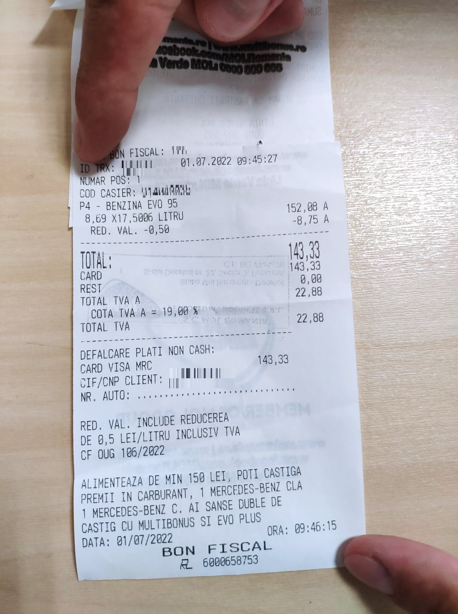 În cazul de față avem un bon fiscal care ne arată că la o alimentare de 152 de lei, clientul va plăti, după aplicarea reducerii, sumă de 143 de lei. Asta înseamnă o reducere de 8,75 de lei.